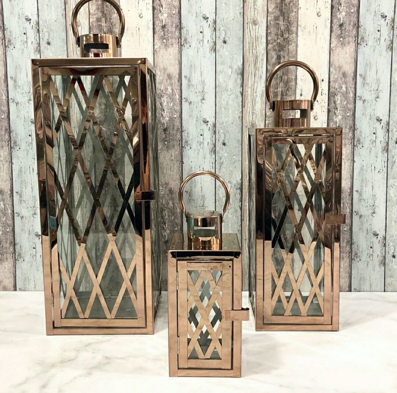 KROM METALİK CAMLI BÜYÜK 3 LÜ FENER MUMLUK BAKIR RENK BAKLAVA DESEN